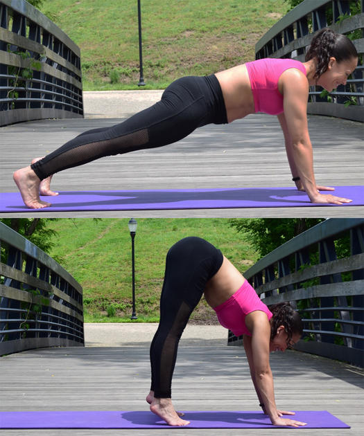 Start in plank position with your hands under shoulders, abs tight and tailbone tucked under. Complete a push-up. Then, walk on the balls of your feet toward your hands, piking your hips in the air. Walk back to plank position. Perform 10 reps to complete 1 set. Do 2 sets.