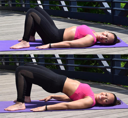 Lie on the back with your knees bent and feet on the floor. Keep your feet hip-width apart. Lift butt off the ground, reaching pelvis as high as you can while squeezing the glutes. Lower your butt toward the ground, then quickly push the pelvis back up to the ceiling. Perform 8 pulses to complete 1 set. Do 8 sets.