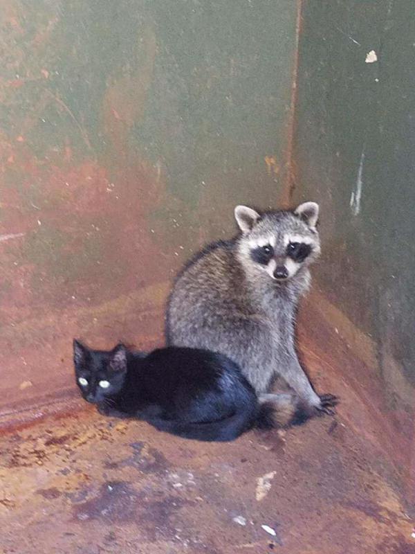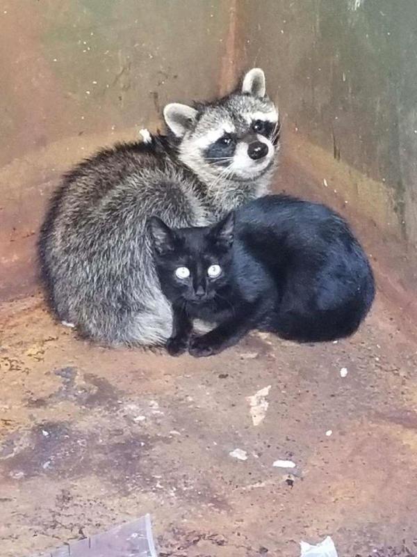 “When Officer Powell looked inside the dumpster he located two unusual companions – a kitten and a baby raccoon – cuddled in the corner keeping each other warm,” the Knoxville Police Department wrote on Facebook.