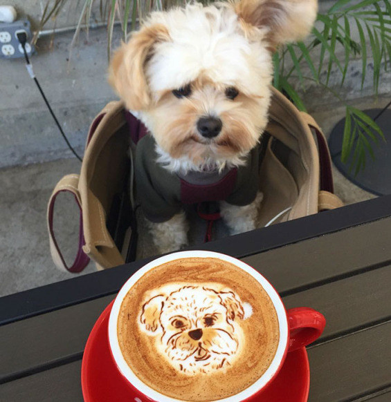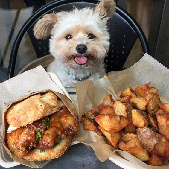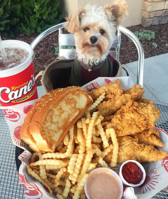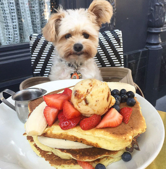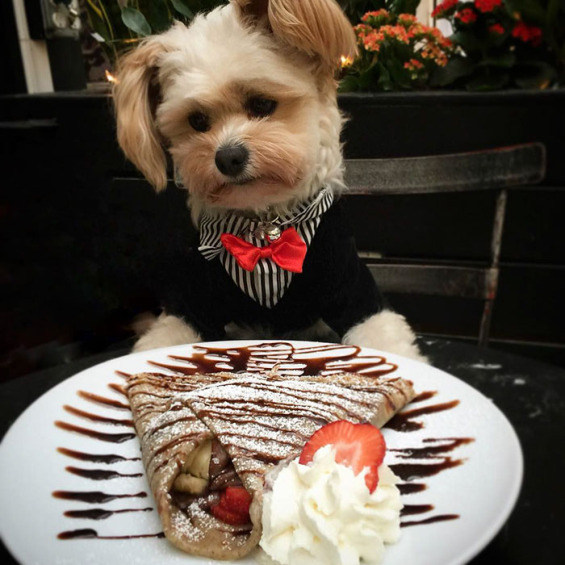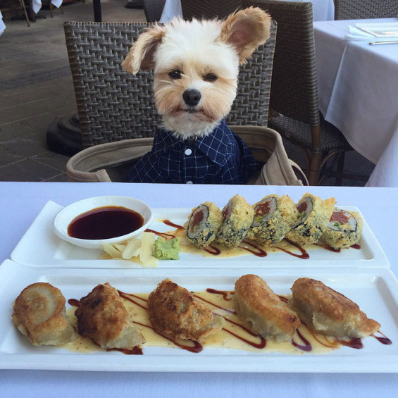 Just take a look at this adorable dog enjoying eating in restaurants.