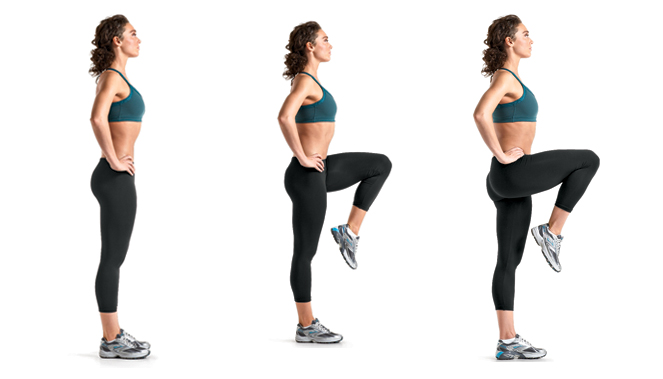 Stand upright and start to lift right and left knee quickly to hip height. Do as many as you can for 60 seconds.