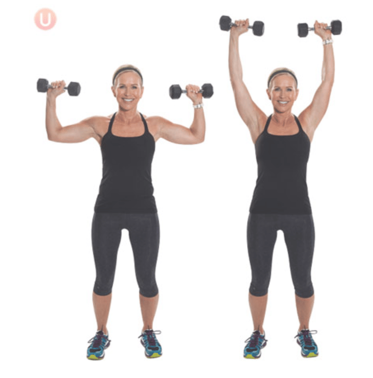 Extend your arms out to sides at shoulder height. Bend your elbows at 90 degrees with palms forward. Then raise arms over head and lower to starting position. Do 30 reps.
