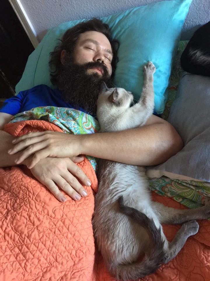 “He’s not so much into getting attention, but he loves to take naps with us and other kitties,” says Karyn.