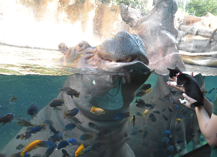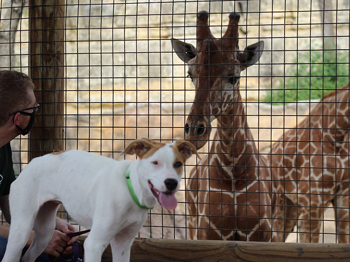 “All the animals were able to have such a unique experience with this event and it was enthralling to see them interact with each other. Carla, the 7-month old white lab-mix was the most intrigued by all the zoo animals. Her favorite being the Giraffes, who seemed equally as curious to see such a strange animal in front of them. Our kittens were in awe of the Hippos and fish, while Ella, the 6-year old black lab-mix thoroughly enjoyed watching the gibbons swing from rope to rope,” explains Michelle Thorson, Development and Marketing Manager for the Animal Defense League of Texas.