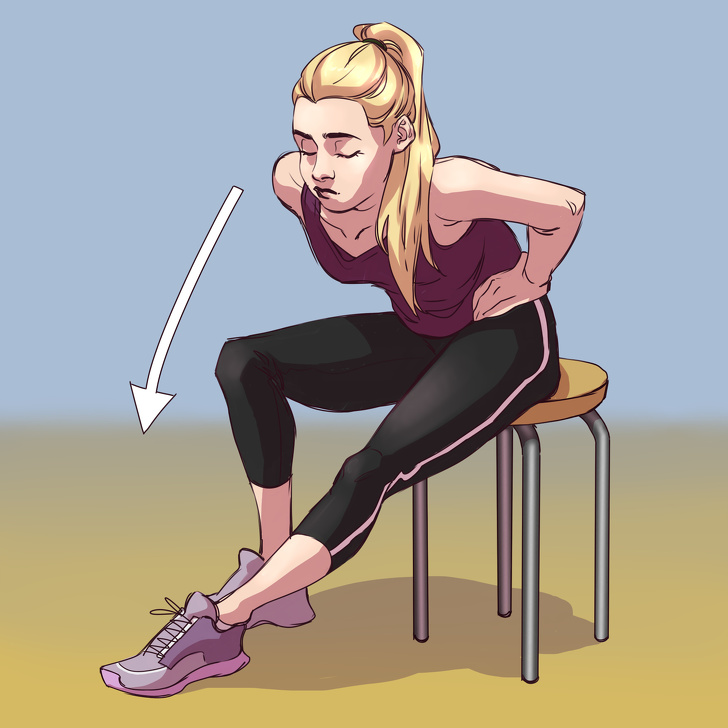 Sit on the edge of a chair with one leg stretched forward. Slowly bend your body towards the leg. Do 10 repetitions and repeat with the other leg.