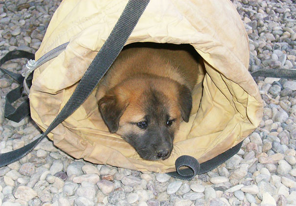 One of our adopted puppies used to hide anywhere he could to stay out of the heat