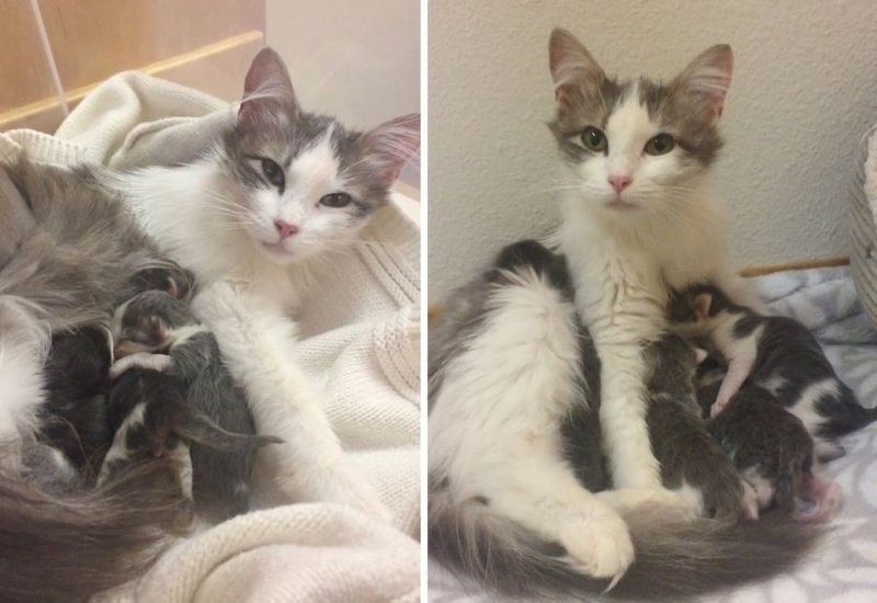 This adorable stray cat was covered in fleas and heavily pregnant when she was brought to an animal shelter. Luckily, the Oregon Friends of Shelter Animals took the cat in and arranged a foster family.