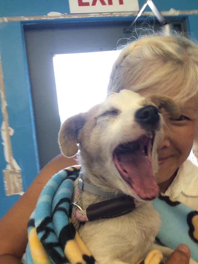 Annabelle was taken to the vet and unfortunately, they determined that she has a tumor on her head, dental issues, an eye infection and skin irritation. Annabelle is receiving treatment for all of her issues and is now recovering in a foster home. Annabelle loves her foster mommy and loves sleeping next to her. She even has doggy siblings and loves spending time with them.