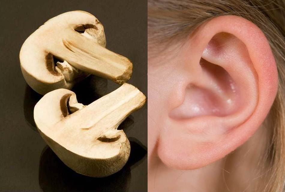 A mushroom cut in half, looks a lot like a human ear. Mushrooms are rich in vitamin D and they can improve your hearing. This vitamin is especially important for healthy bones, even the tiny ones in the ear that transmit audio signals to the brain.