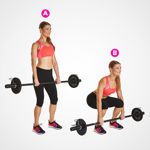 Stand up straight, holding a 35-45 pound barbell in front of your thighs. Your hands should be a bit wider than your shoulders. Keep your shoulders pulled back and down and your chest lifted. Bent your knees, reach your hips back and let the bar slide down your legs. As the bar passes your knees, lower your hips into a squat position. Take a 2 second break, press into your heels and stand up. Do 15 repetitions.