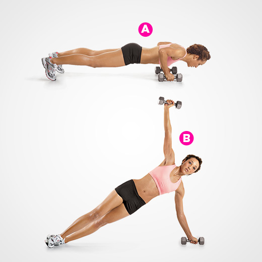 Hold a 5-pound dumbbell in each hand and start at the top of a push up position. Lower towards the floor by bending your elbows and end when your chest are 4-6 inches from the floor. Press to raise back up. Rotate your right side of your body so you’ll open to the right. Pull your right hand into your torso and turn both feet- your toes should be forward with feet flexed. Once you’re stable, push the right hand over your right shoulder. Bring your arm back to pushup position and repeat, rotating to the left side. Do 5 repetitions.
