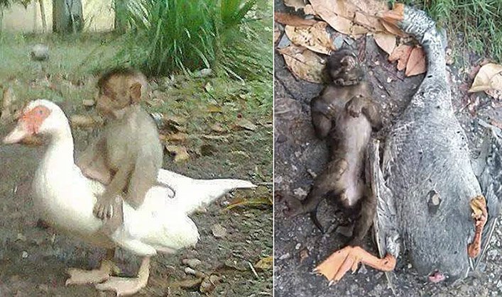 This is a genuine story of a true friendship that will break your heart to small pieces. The monkey and the duck have been friends since birth and they spent each moment together. The little monkey was playing around and unfortunately touched a live wire and got electrocuted. He screamed of pain. The duck heard his scream and came running to help. Unfortunately, trying to get the wire off the little monkey, the duck also got electrocuted.