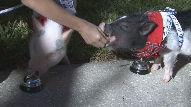 “People get so excited, no matter if they’re an adult or a kid, they just start smiling,” says Claire Barrow, the pigs’ trainer. “It’s nice to see it because they are going through a very hard time and it’s nice to see a smile on their face.”