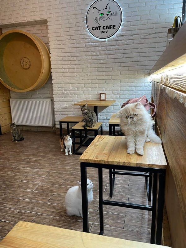 Cat cafes are cafes where you can enjoy a cup of coffee and a warm meal and hang with the cats that live there. The city of Lviv in Ukraine has a beautiful cat café, and its owners are the bravest people. They didn’t close their café even when the city was attacked because they didn’t want to leave the cats behind.