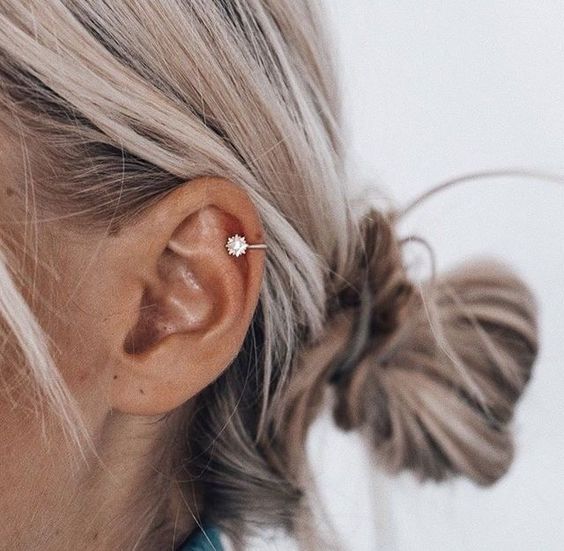 The tragus is a small and cute part of the ear. This location is the most popular piercing for girls. The area is pretty sensitive that is why it is better to use a barbell first and then change it to a ring or other jewelry after it has completely healed. The healing process lasts for 4 months.