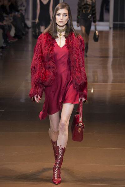 Donatella Versace sent an army of models on the runway dressed in creations inspired from the military uniform. Big buttons placed on asymmetric dresses made from two totally different materials, furry coats, jackets and ultra short skirts.