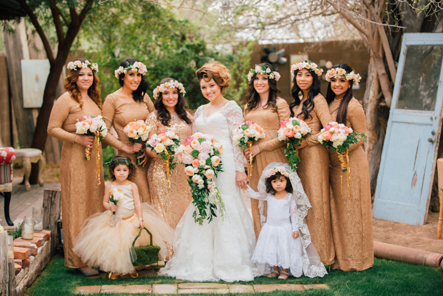 Lace and flowers are central to most vintage theme ideas so a lace dominated wedding dress is a great way to go. Opt for full length, lace sleeves for both the bride’s dress and for the bridesmaids for that vintage look with lace overlays on the dresses themselves being another great touch. For the little bridesmaids or flower girls, you could opt for a full-on ballerina tutu style dress with many layers of netting to complete the look.