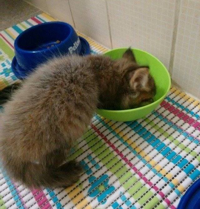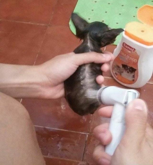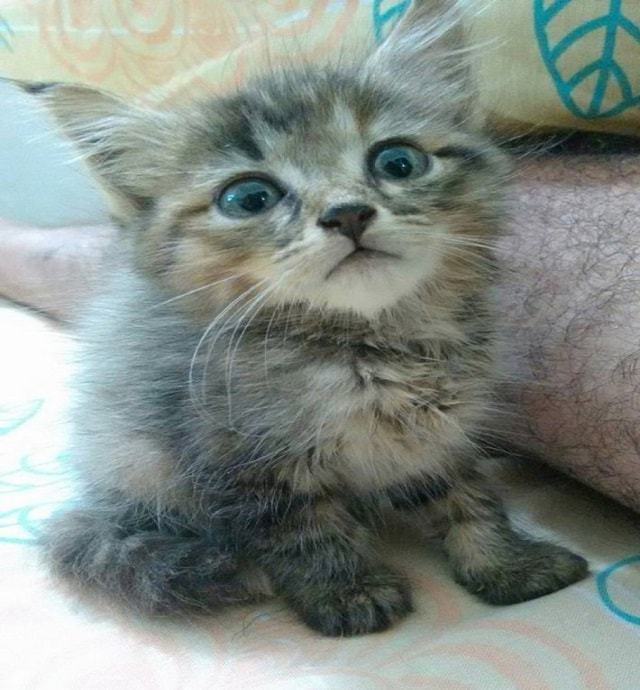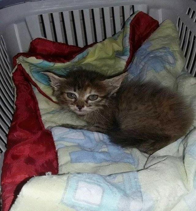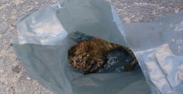 She opened the bag and what she saw shocked her – a dirty little kitten, all wet, with desperate need of help. The abandoned kitty was very scared and was shaking up. She decided to take him home.