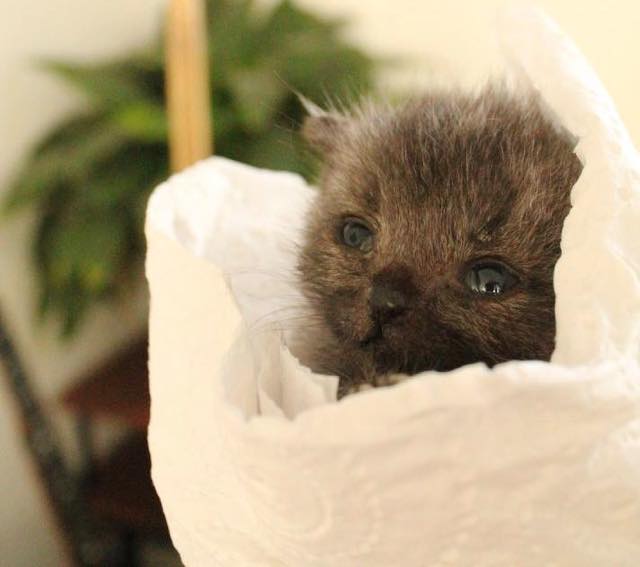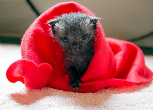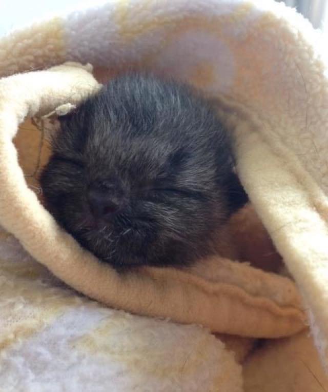 She knew that this extremely small kitten with his umbilical cord still attached wouldn’t survive up there alone in the rain, so she decided to take him home.