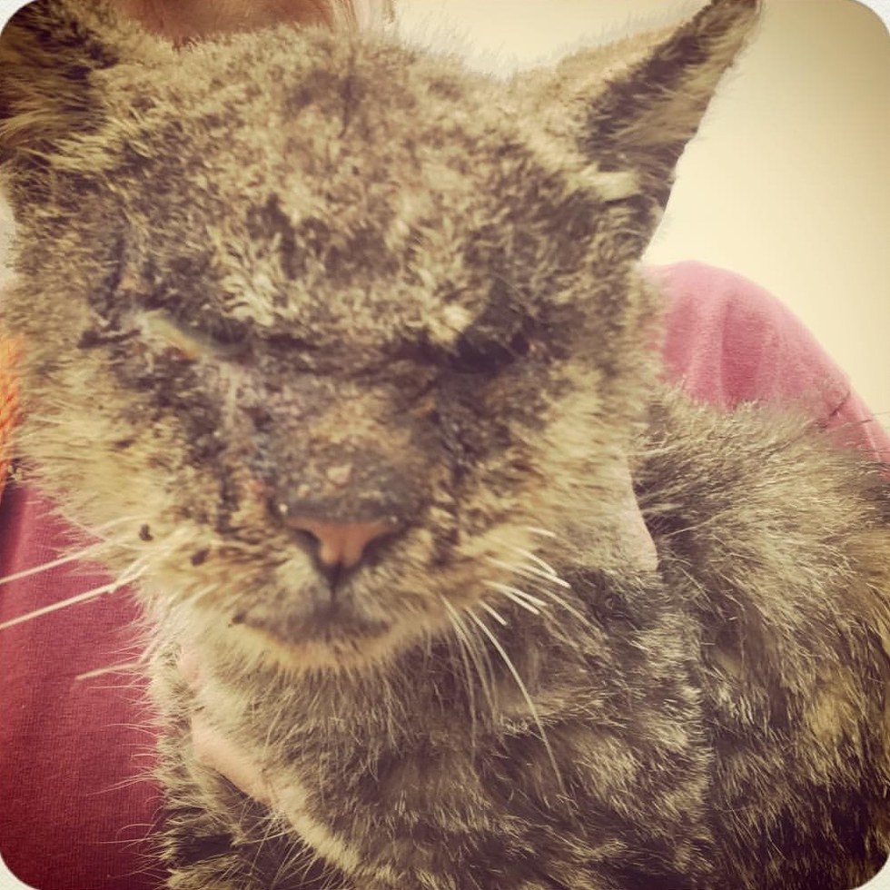 Meet Valentino, the cat who had a really rough past. Nobody in the shelter where he was left knows his story, but it was evident that his life had been very tough. He was all covered in dirt and suffered from a very contagious skin disease called sarcoptic mange. His eyes were completely closed from the infection.