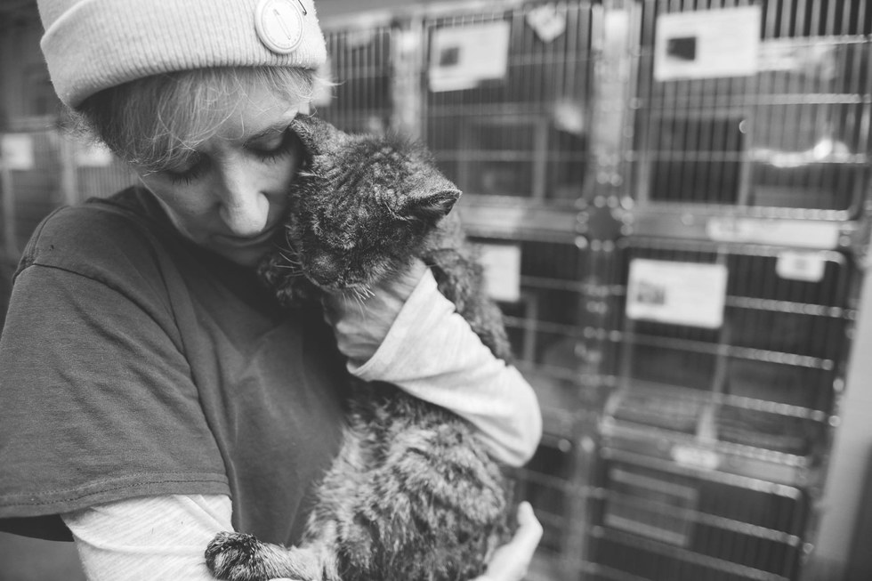 Many thought that this sick cat was at death’s door, and no one wanted to touch him, except for this amazing woman. When Elaine Seamans headed to medical at the Baldwin park shelter, she noticed the poor cat and she was shocked by his appearance. She opened his cage door and took Valentino in a warm embrace. Then the kitty put his head on her shoulder and made the tiniest cry for help.